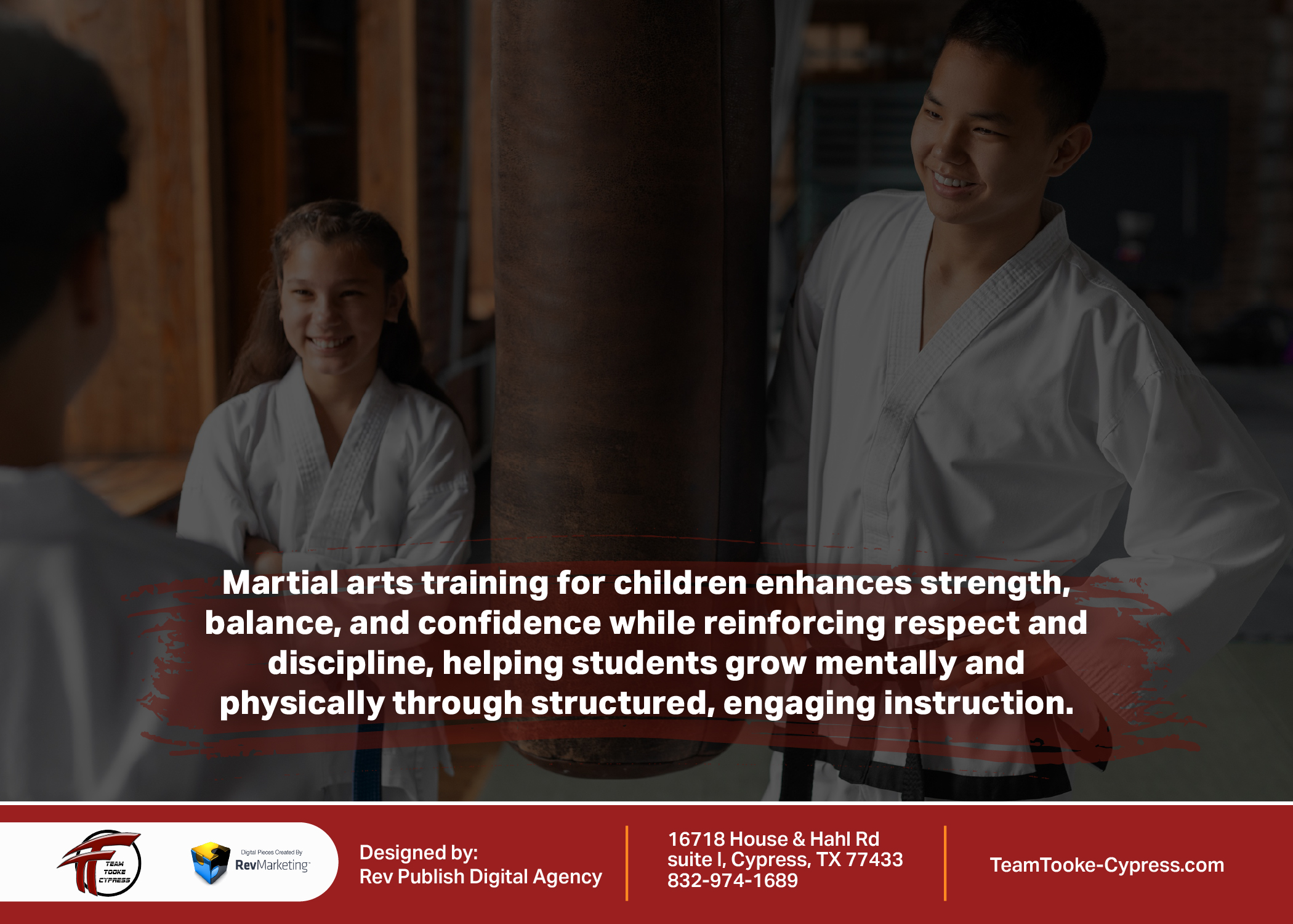 Team Tooke-Cypress martial arts training for children enhances strength, balance, and confidence while reinforcing respect and discipline—helping students grow mentally and physically through structured, engaging instruction.