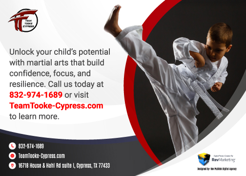 Unlock your child’s potential with martial arts that builds confidence, focus and resilience. Call us today at 832-974-1689 or visit TeamTooke-Cypress.com to learn more.