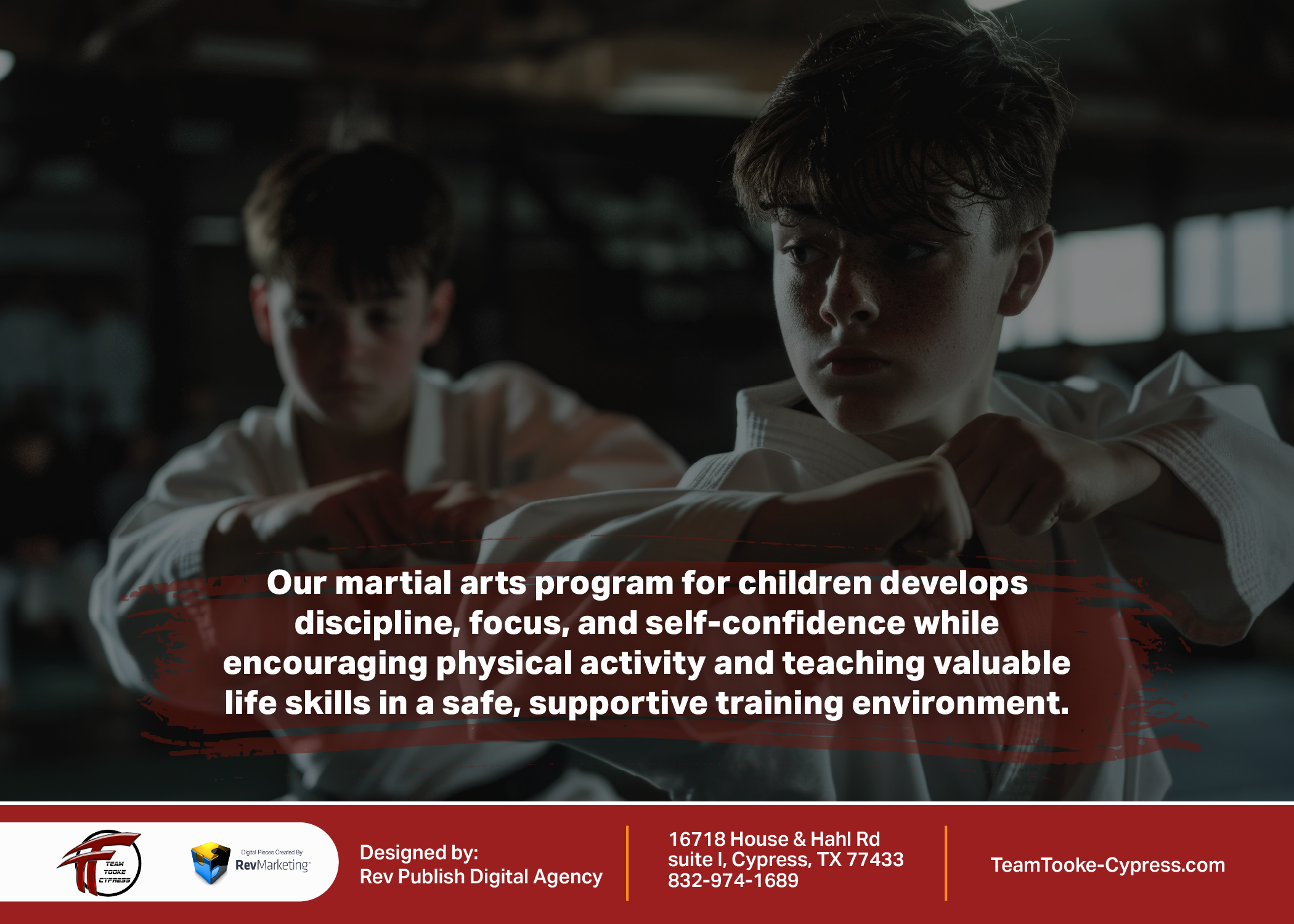 Team Tooke-Cypress martial arts program for children develops discipline, focus, and self-confidence while encouraging physical activity and teaching valuable life skills in a safe, supportive training environment.